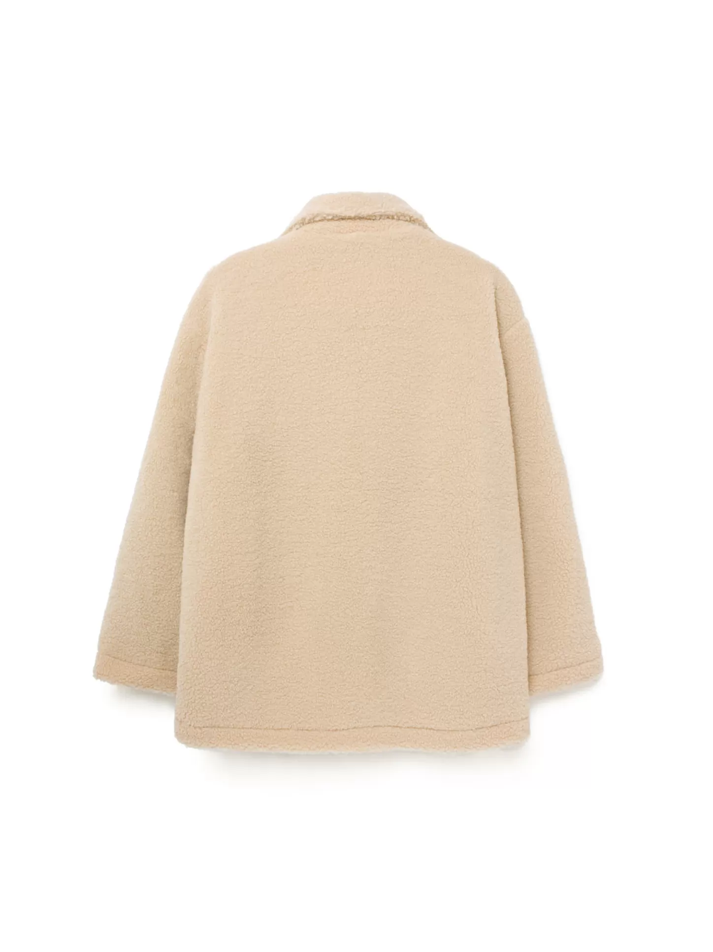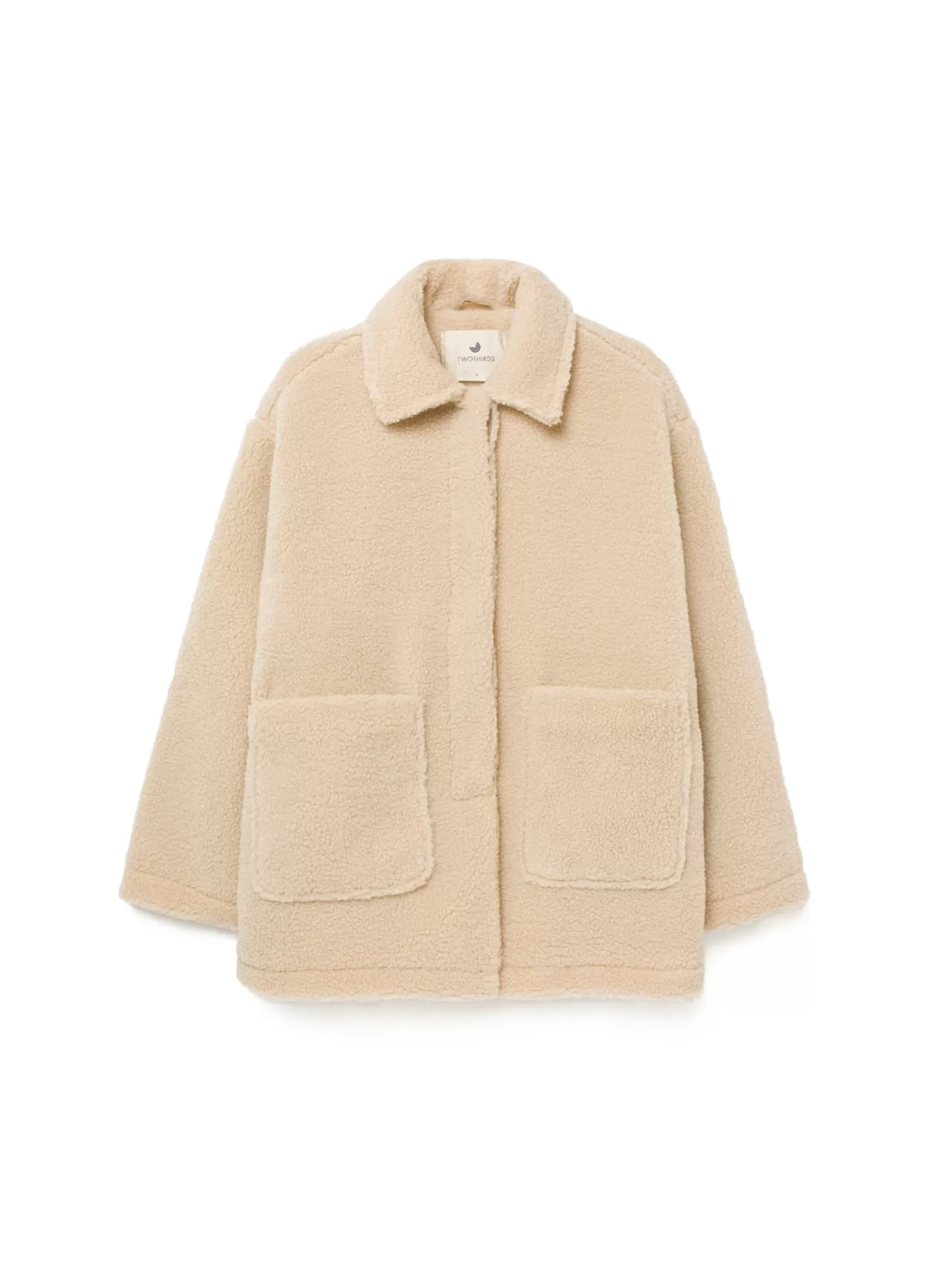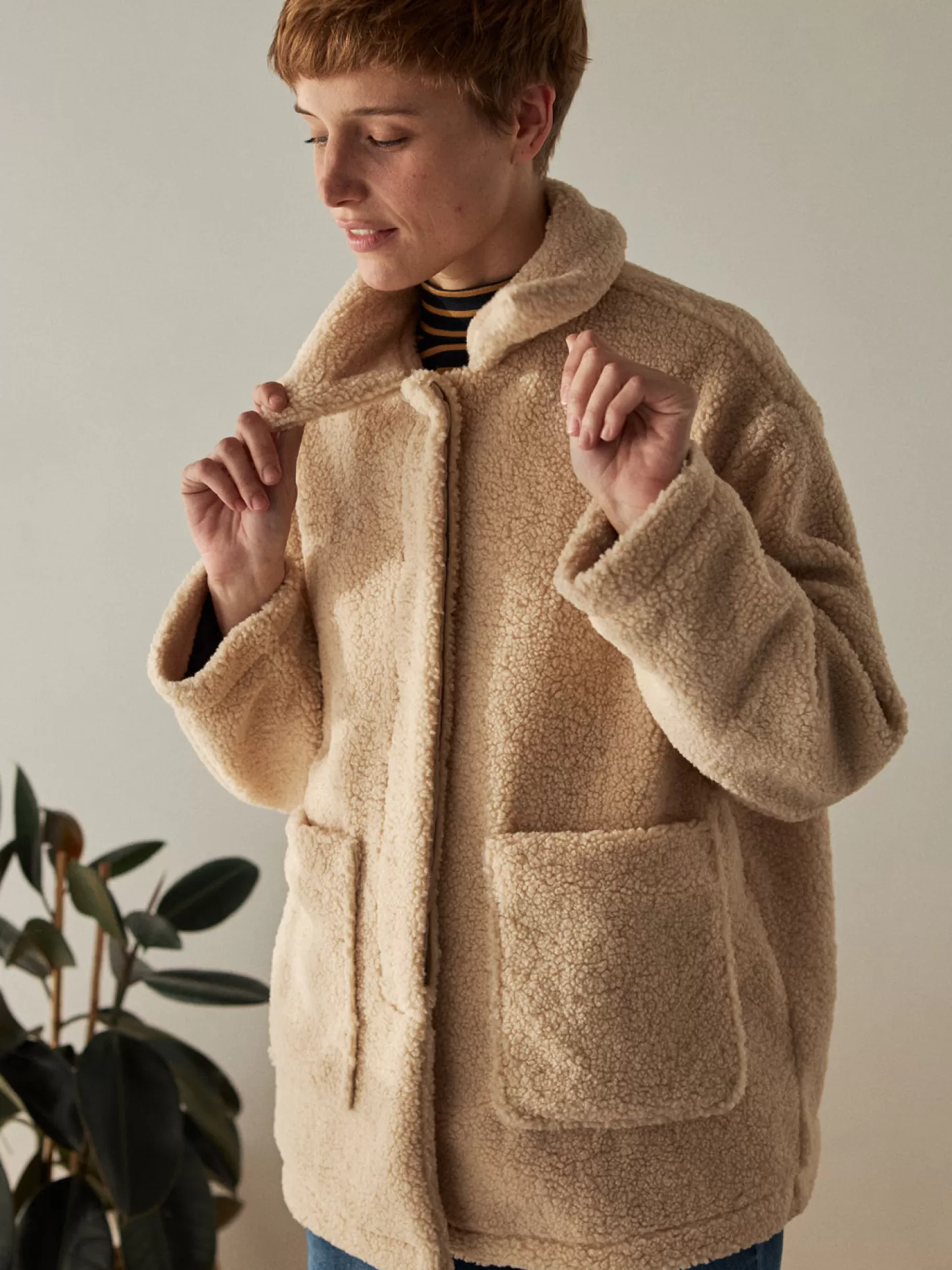 Our New Fluffy And Cosy Addition, The Kalotina Coatmade Of Recycled Plastics And Soft Organic Cotton For The Body Lining. Designed With A Regular Collar, 3 Pockets (One On The Inside) On The Front And Naturally Sourced Corozo Buttonshidden Under The Fabric. The Garment Comes In A Fairly Oversized Fit And It Falls Below The Hips.