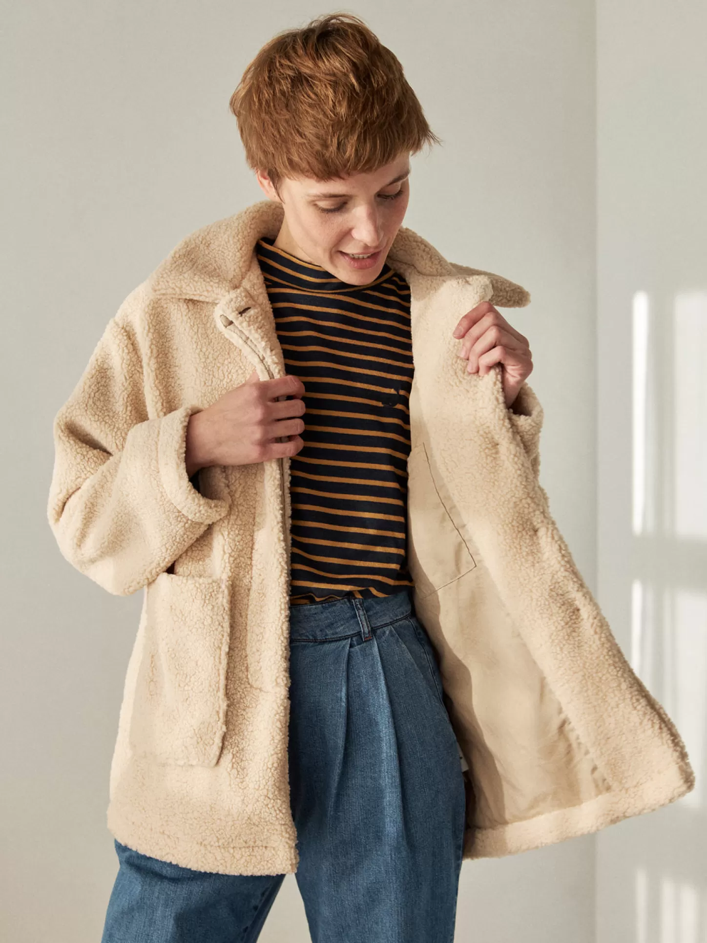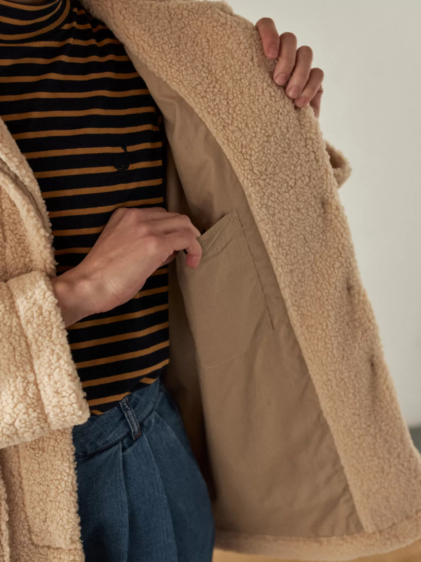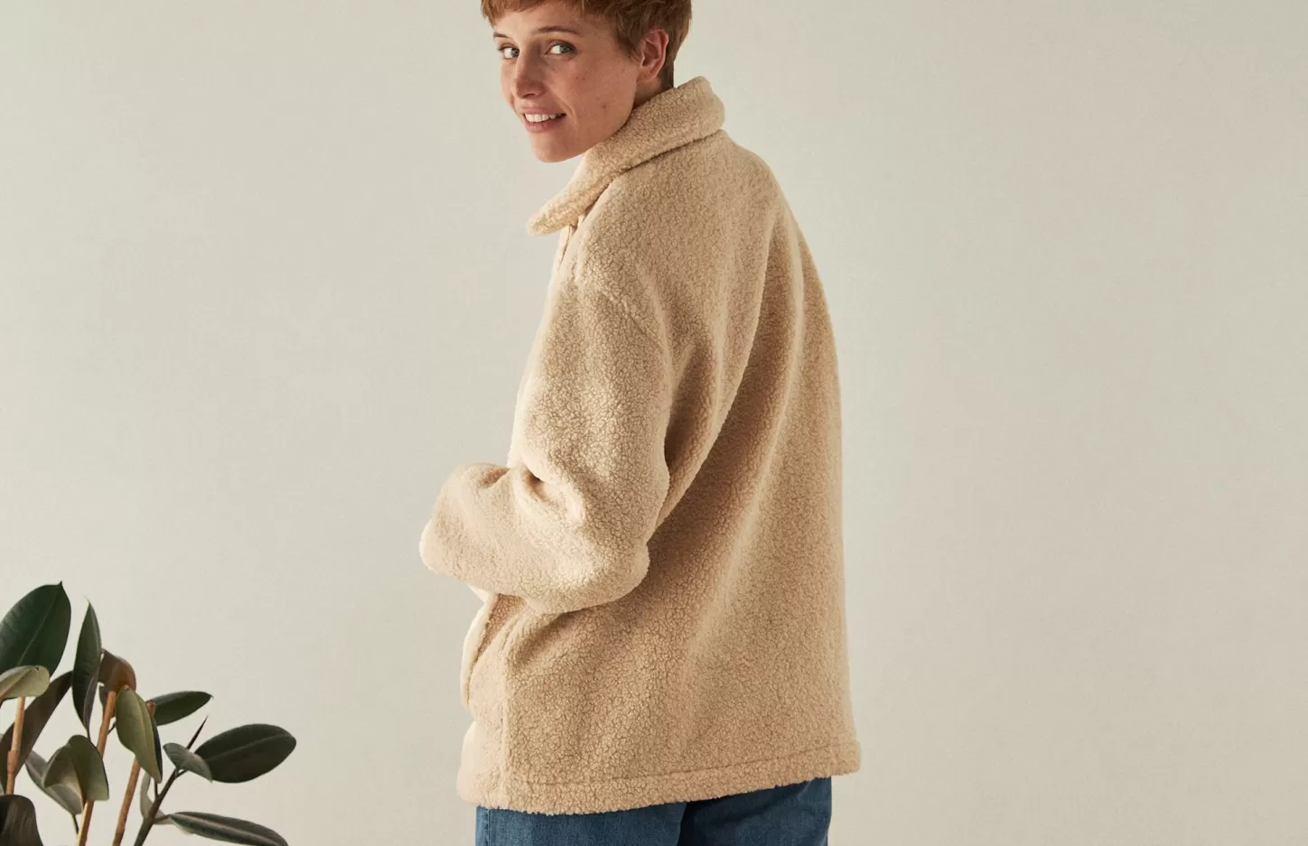 Our New Fluffy And Cosy Addition, The Kalotina Coatmade Of Recycled Plastics And Soft Organic Cotton For The Body Lining. Designed With A Regular Collar, 3 Pockets (One On The Inside) On The Front And Naturally Sourced Corozo Buttonshidden Under The Fabric. The Garment Comes In A Fairly Oversized Fit And It Falls Below The Hips.